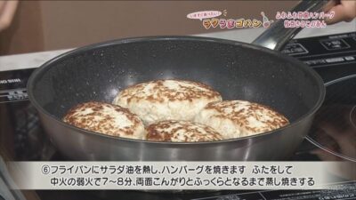 フライパンにサラダ油を熱し、ハンバーグを焼きます。蓋をして中火の弱火で7~8分、両面こんがりとふっくらとなるまで蒸し焼きにします。