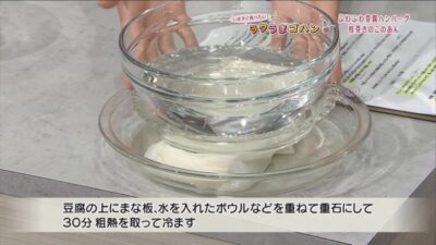 豆腐は、2等分に切ってから各々キッチンペーパーで包んで耐熱皿におき、ラップをかけずに600Wのレンジで2分半加熱。豆腐の上にまな板、水を入れたボウルなどを重ねて重石にして30分粗熱を取って冷まします。