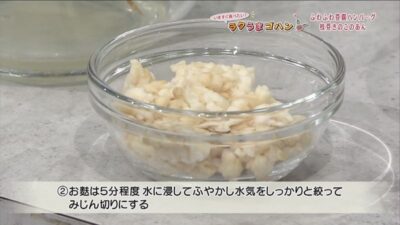 お麩は5分程、水に浸してふやかし、水気をしっかりと絞ってみじん切りにします。