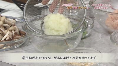 玉ねぎをすりおろし、ザルにあげて水分を切っておきます。