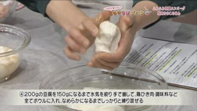 200gの豆腐を150gになるまで水気を絞り、手で崩して、鶏ひき肉・調味料など全てボウルに入れ、なめらかになるまでしっかりと練り混ぜましょう。