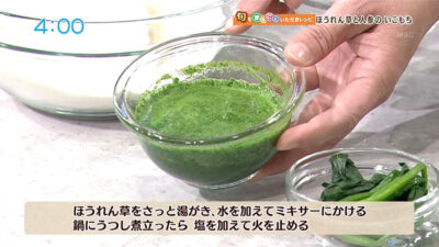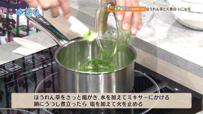 ほうれん草をさっと湯がき、水を加えてミキサーにかける。火にかけて煮立ったら、塩を加えて火を止める。