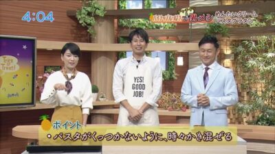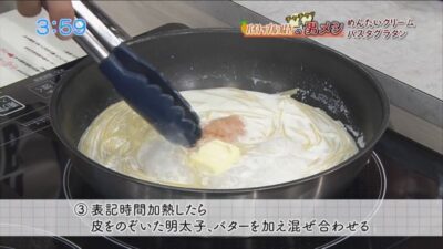 表記の時間 加熱したら皮をのぞいた明太子、バターを加え混ぜ合わせます。