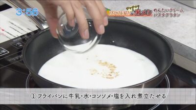 フライパンに牛乳・水・コンソメ・塩を入れ、煮立たせます。