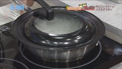 半分に折ったパスタを入れたら、ふたをして表記の時間加熱します。