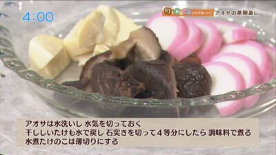 アオサは水洗いし、水気を切っておきます。干し椎茸も水で戻し、石突きを切って4等分にしたら、調味料で煮ます。水煮たけのこは薄切りにします。