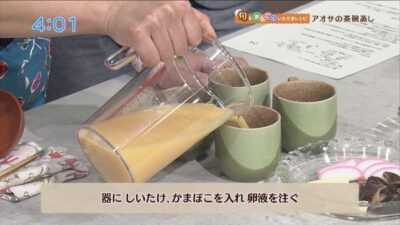 器に、椎茸、かまぼこを入れ、卵液を注ぎます。