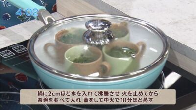 鍋に2cmほど水を入れて沸騰させ、火を止めてから茶碗を並べて入れ、蓋をして中火で10分ほど蒸します。
