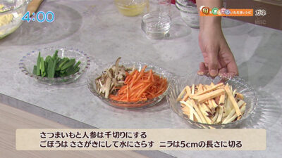 さつまいもと人参は千切りにする。ごぼうはささがきにして水にさらす。ニラは5cmの長さに切る。