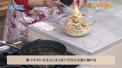 食べやすい大きさにまとめて170℃の油で揚げる。