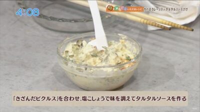 きざんだピクルスを合わせ、塩こしょうで味を調えてタルタルソースを作ります。