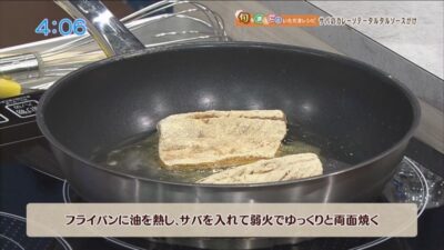 フライパンに油を熱し、サバを入れて弱火でゆっくりと両面焼く※蓋をするとふんわり仕上がります。