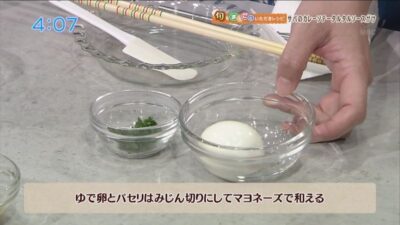 ゆで卵とパセリはみじん切りにしてマヨネーズで和えます。