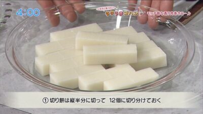 切り餅を縦半分に切って、12個に切り分ける。