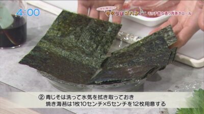 青じそは洗って水気をふき取っておく。焼き海苔は、1枚・10cm×5cmを12枚用意する。