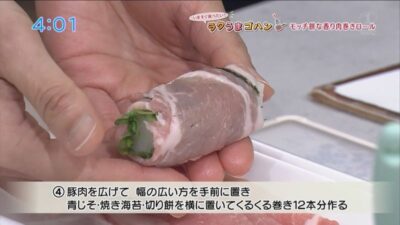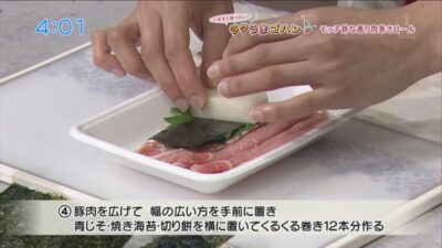 豚肉を広げて、幅の広い方を手前に置き、青じそ・焼き海苔・切り餅を横向きに置いて、くるくると巻き、12本分作る。