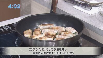フライパンにサラダ油を熱し、肉巻きの巻き終わりを下にして焼く。