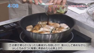 お餅が柔らかくなったら、合わせておいた醤油ダレを回しかけ、強火にして絡めながら少しとろみがつく程度に煮詰めたら、出来上がり。
