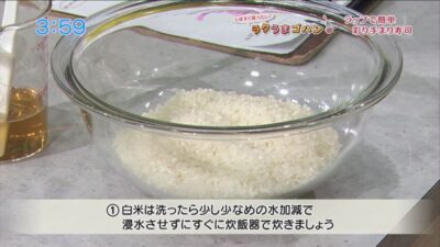 白米は洗ったら少し少なめの水加減で、浸水させずにすぐに炊飯器で炊きましょう。