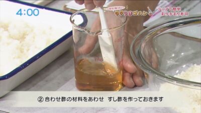 合わせ酢の材料をあわせ、すし酢を作ります。