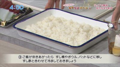 ご飯が炊きあがったら、すし桶やボウル、バットなどに移し、すし酢と合わせて冷ましておきましょう。