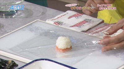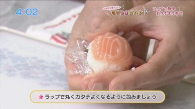 ラップを適当な長さに切り、お刺身の裏側を上にして、酢飯を20~25gとり、軽く丸めてからお刺身の上に載せ丸めます。