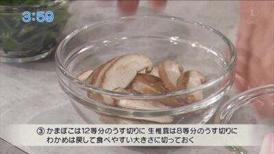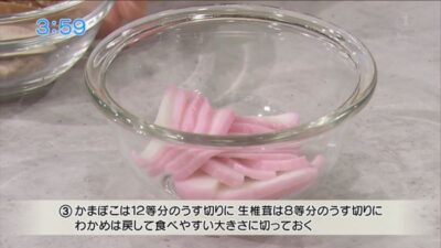 かまぼこは12等分のうす切りに、生椎茸は8等分のうす切りに、ワカメは戻して食べやすい大きさに切る。