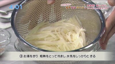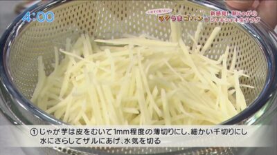 じゃが芋は皮をむいて1mm程度の薄切りにし、細かい千切りにし、水にさらしてザルにあげ、水気を切ります。