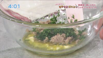 ツナ缶を油切りをして、茎ごとみじん切りにしたパセリ、ドレッシングの材料と一緒にボウルで混ぜます。