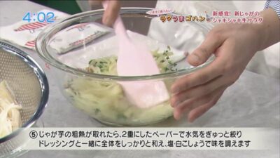 じゃが芋の粗熱が取れたら、二重にしたペーパーで水気をぎゅっと絞り、ドレッシングと一緒に全体をしっかりと和え、塩・白こしょうで味を調える。