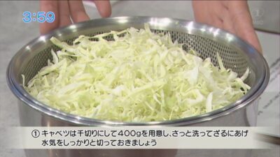 キャベツは千切りにして400gを用意し、さっと洗ってざるにあげ、水気をしっかりと切っておくきます。
