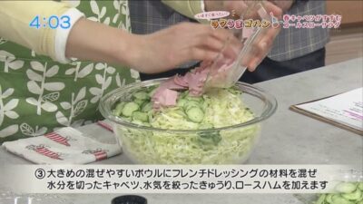 大きめの混ぜやすいボウルにフレンチドレッシングの材料を混ぜ、水分を切ったキャベツ、水気を絞ったきゅうり、ロースハムを加えます。