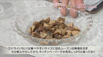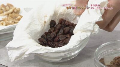 ドライいちじくは食べやすいサイズに切ります。レーズンは熱湯を注ぎ、5分程ふやかしてから、キッチンペーパーで水気をしっかりと絞っておきます。