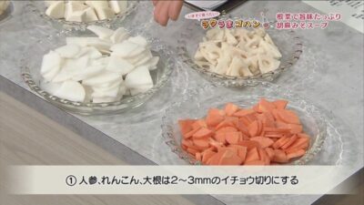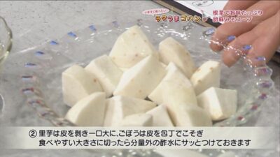 人参、れんこん、大根は一口大に乱切りに、里芋は皮を剥き一口大に切ります。