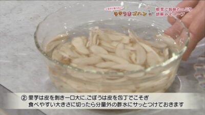 ごぼうは皮を包丁でこそぎ、食べ易い大きさに切ったら分量外の酢水にサッとつけておきます。