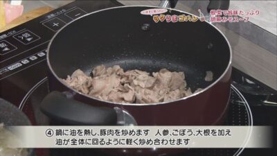 鍋に油を熱し、豚肉を炒めます。人参、ごぼう、大根を加え油が全体に回るように軽く炒め合わせます。