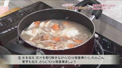 水を加え、灰汁を取り除きながら10分程度煮たら、れんこん、里芋も加え、さらに10分程度煮ましょう。