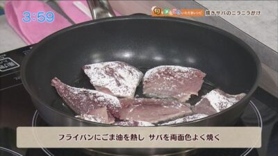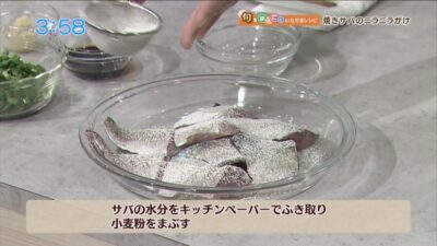 サバの水分ををキッチンペーパーでふき取り、小麦粉をまぶす。