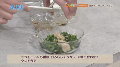 ごま油でパリッと焼いたサバに生姜とごま油で和えたニラをたっぷりかけていただきます。