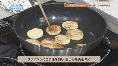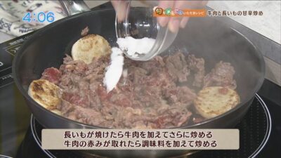 長いもが焼けたら牛肉を加えてさらに炒める。牛肉の赤身が取れたら、調味料を加えて炒める。