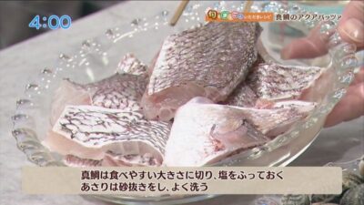 真鯛は食べやすい大きさに切り、塩をふっておく。あさりは砂抜きをし、よく洗います。