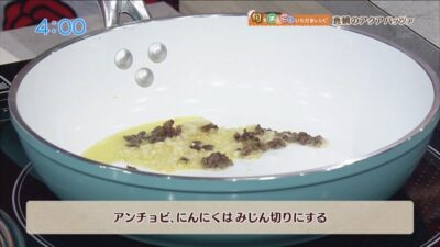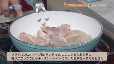 フライパンにオリーブ油、アンチョビ、ニンニクを入れて熱し香りが立ってきたらキッチンペーパーで拭いた真鯛を入れて両面焼きます。