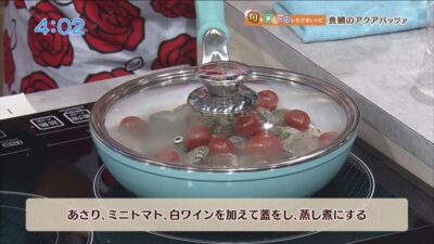 あさり、ミニトマト、白ワインを加えて蓋をし、蒸し煮にします。