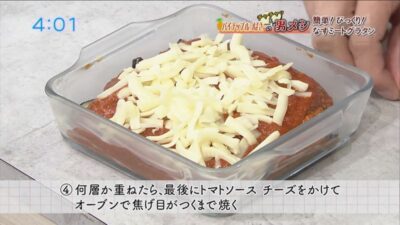 何層か重ねたら、最後にトマトソース、チーズをかけてオーブンで焦げ目がつくまで焼く。