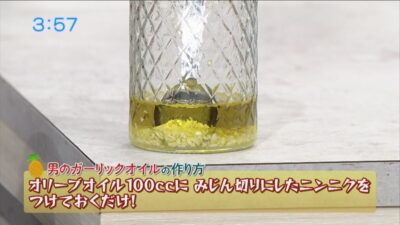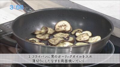 フライパンに男のガーリックオイルを入れ、薄切りにしたなすを両面焼いていく。