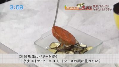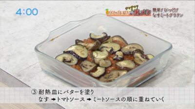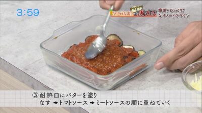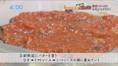 耐熱皿にバターを塗り、なす→トマトソース→ミートソースの順に重ねていく。