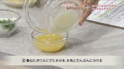 重ねたボウルにでた水分を、水気とでんぷんに分けます。