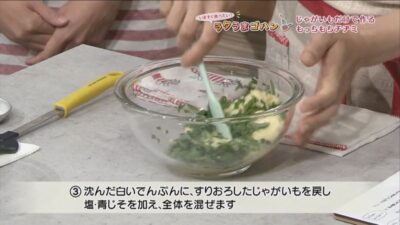 沈んだ白いでんぷんに、すりおろしたじゃが芋を戻し、塩・青じそを加え、全体を混ぜます。