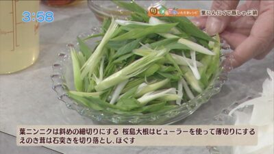 葉ニンニクは斜めの細切りにする桜島大根はピューラーを使って薄切りにする。えのき茸は石突きを切り落とし、ほぐす。