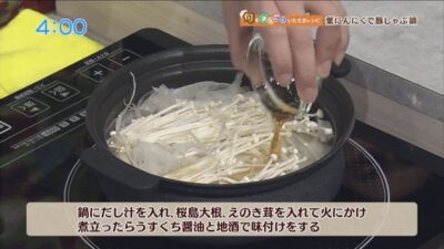 鍋にだし汁を入れ、桜島大根、えのき茸を入れて火にかけ煮立ったらうすくち醤油と地酒で味付けをする。